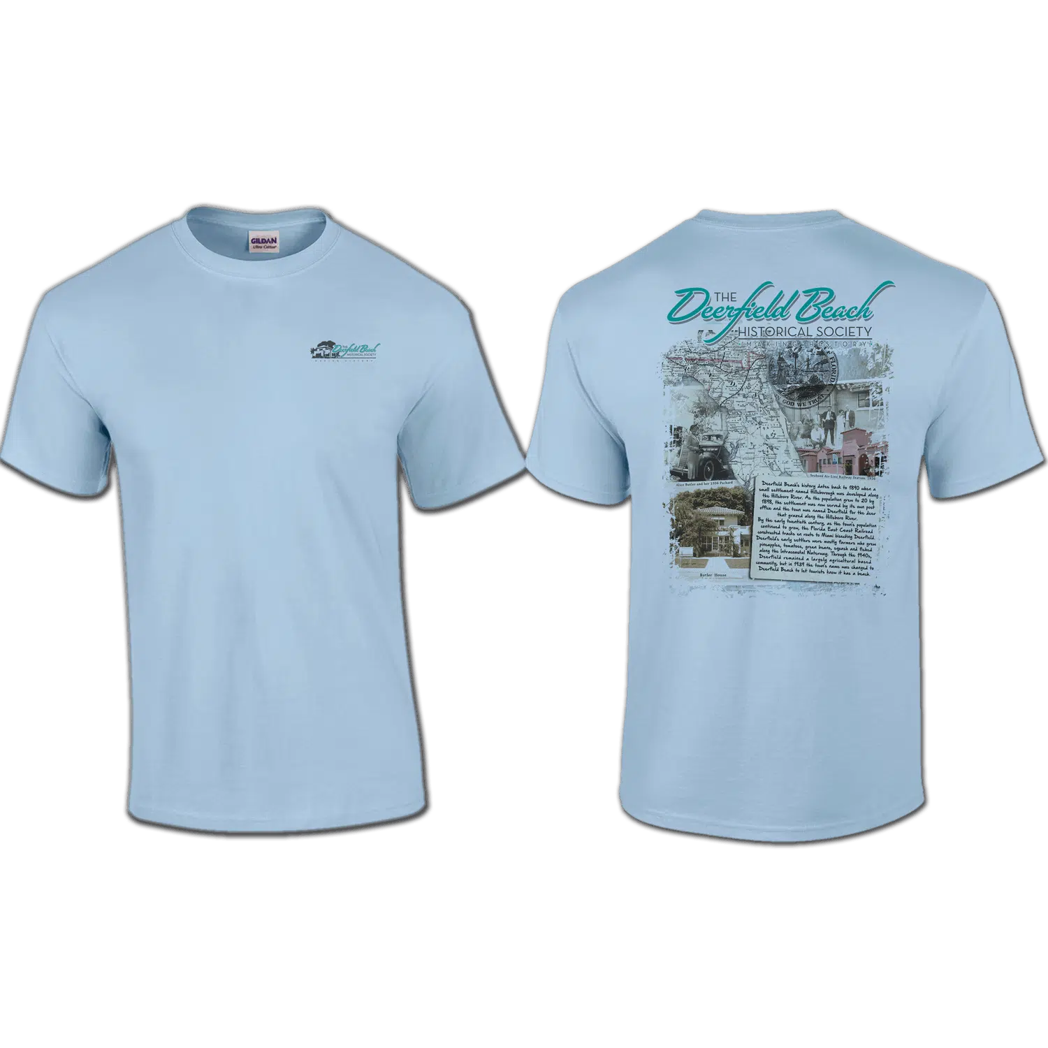 Men’s pocket/back print t-shirtย with a Deerfield Beach Historical Society logo.